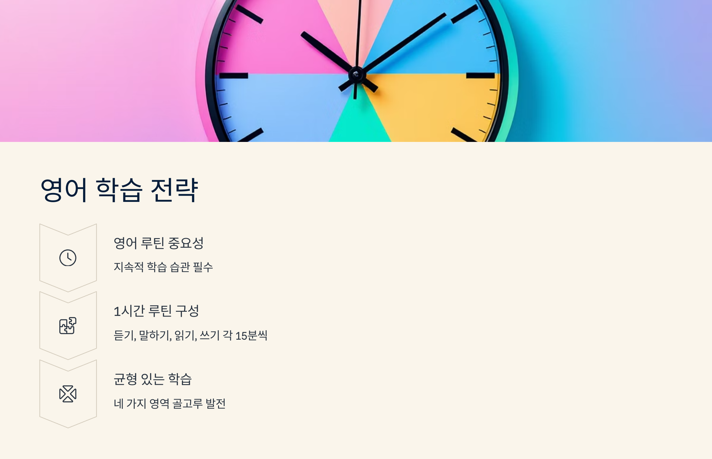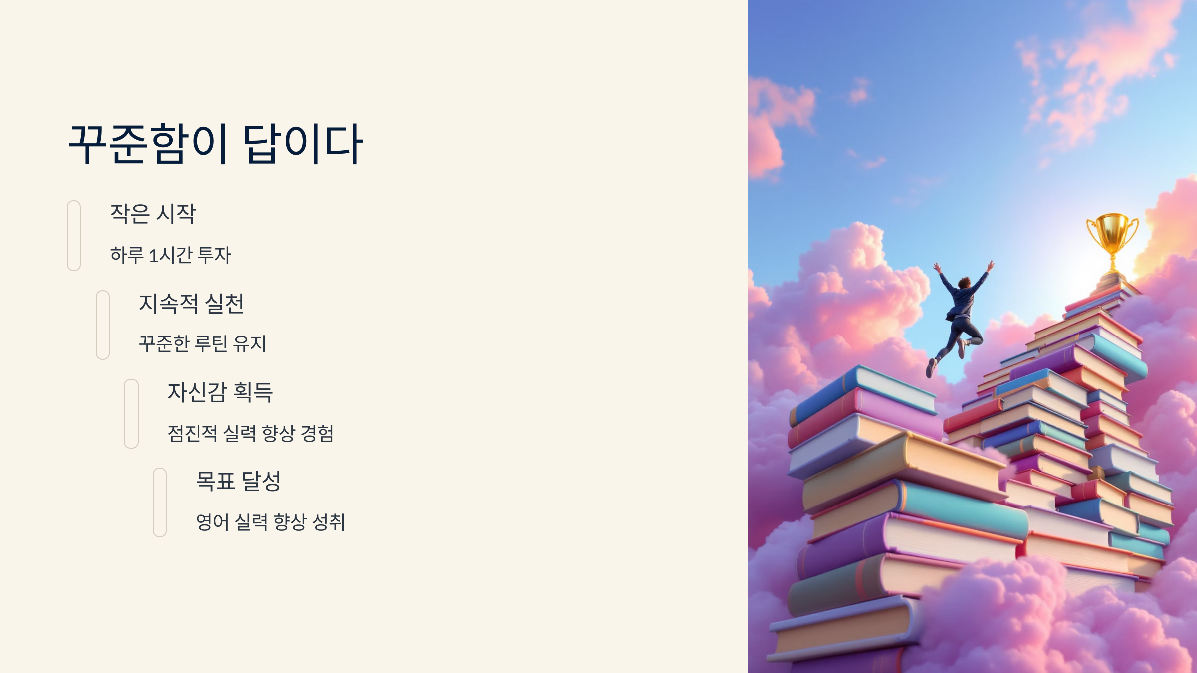 하루 1시간의 영어 학습은 작지만 강력한 변화의 시작입니다. 중요한 것은 꾸준함입니다. 오늘부터 나만의 루틴을 만들어보세요. 작은 실천이 큰 변화를 만들어냅니다.