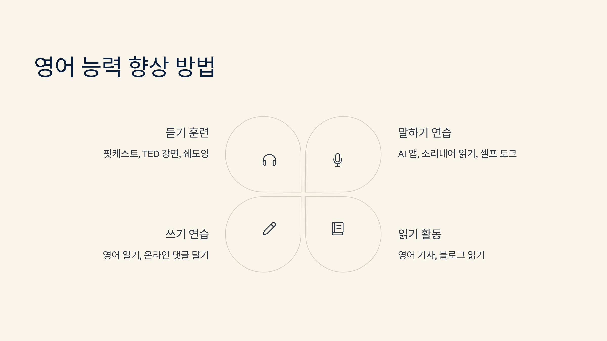 이렇게 네 가지 영역을 균형 있게 학습하면 전반적인 영어 실력을 향상시킬 수 있습니다.