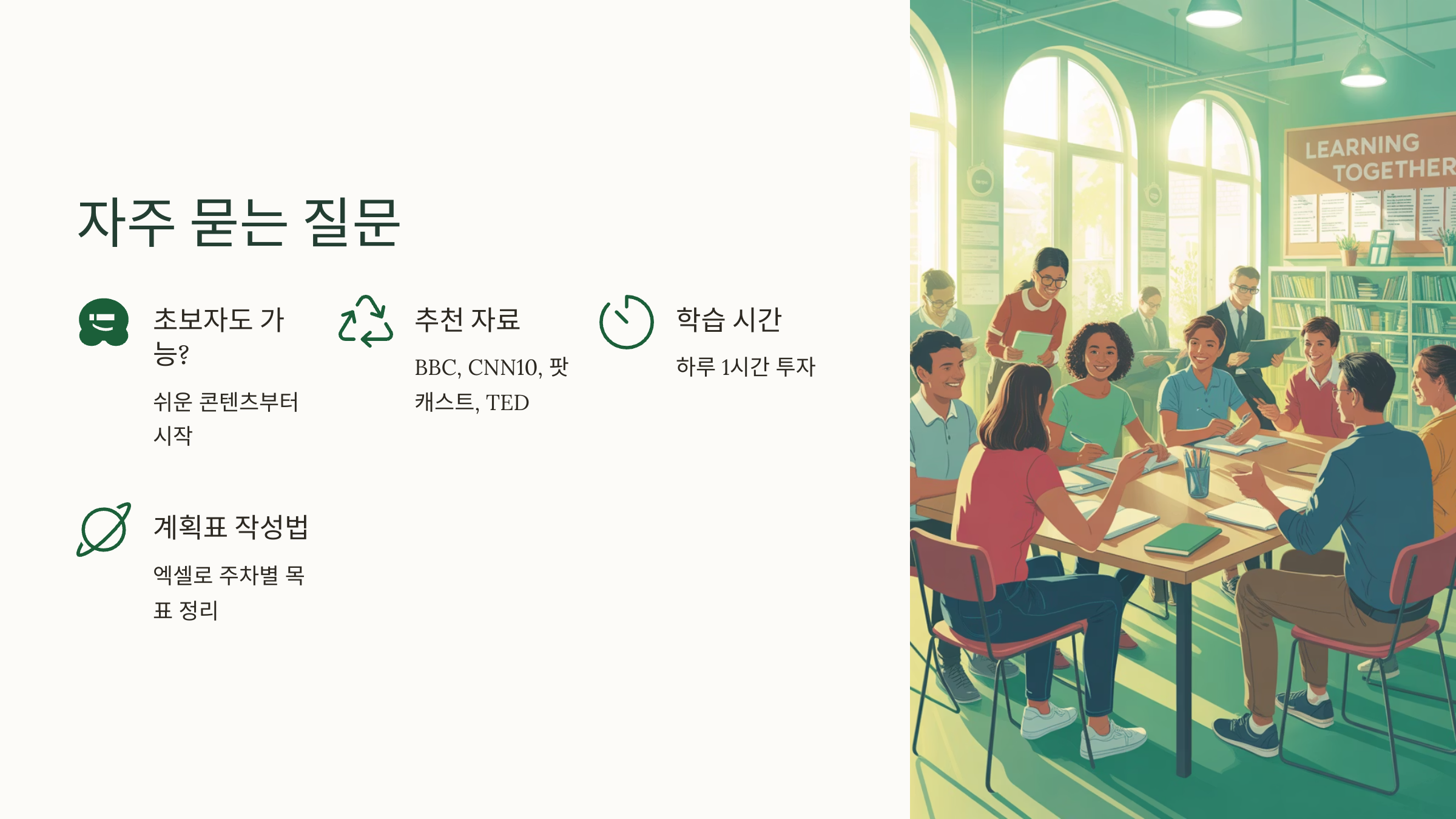 이후에도 루틴을 유지하려면 ‘매주 영어 챌린지’를 하는 것도 좋아요. 예: ‘이번 주엔 뉴스 요약하기’, ‘5개 관용구 외우기’ 등