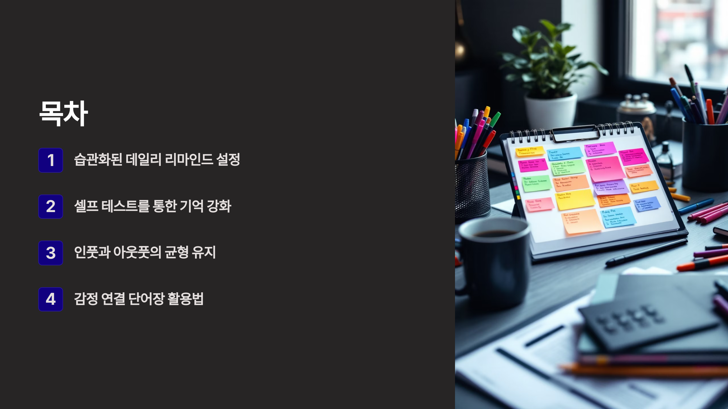 복습 주기를 활용해 반복하세요. 감정과 함께 연결하는 것도 큰 도움이 됩니다!