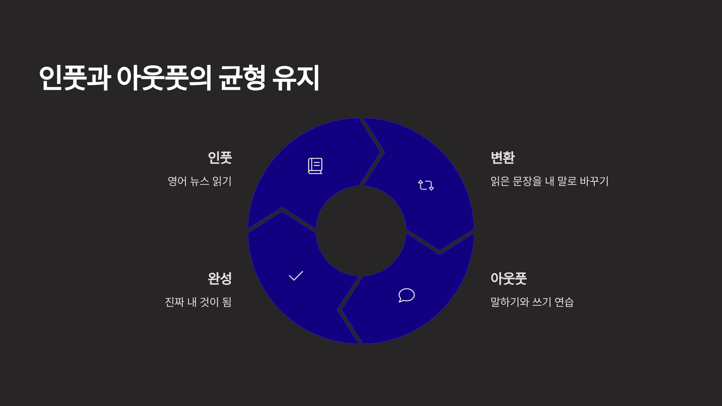 하루에 30분씩 영어 뉴스 읽기만 하다 보니, 듣기는 늘어도 말은 전혀 안 늘더라고요. 그래서 바꿨습니다. 읽은 문장을 ‘내 말’로 바꿔보는 훈련을 했죠. 예: "The company is expanding its market" → “My company is growing too.” 이런 식으로요! 내가 말할 수 있는 영어로 바꾸는 반복 훈련은 진짜 도움이 됩니다. 인풋과 아웃풋은 세트로 가야 해요!