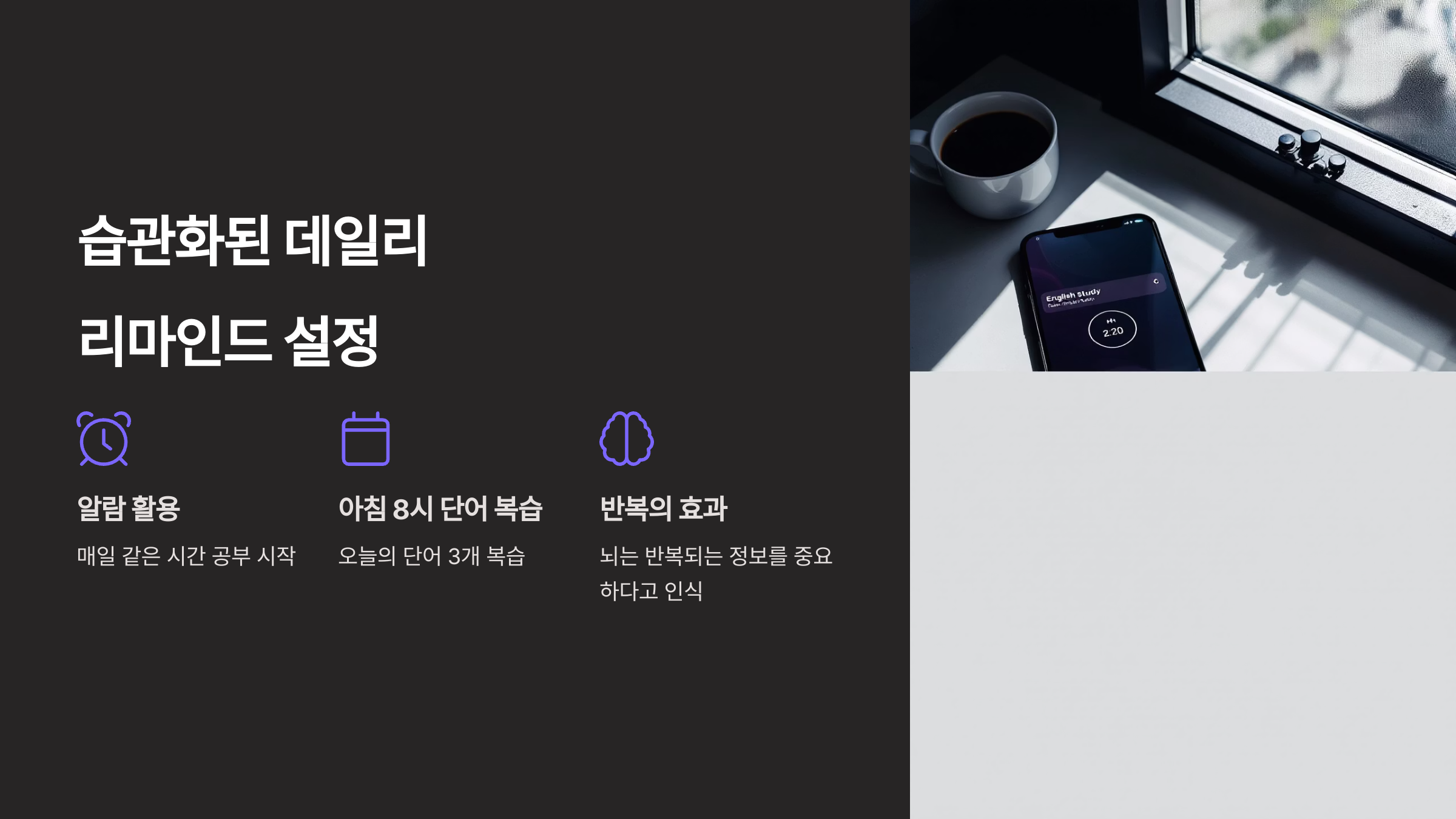 알람을 활용해 매일 같은 시간에 공부를 시작해보세요. 특히 저는 아침 8시에 ‘오늘의 단어 3개 복습’ 알람을 설정했는데요, 이 단순한 습관 하나가 영어 실력에 큰 영향을 줬습니다. 뇌는 반복되는 정보를 ‘중요하다’고 인식하니까요. 처음엔 귀찮아도, 하루 5분씩 투자해보세요. 나중엔 스스로 영어 생각이 나기 시작합니다!