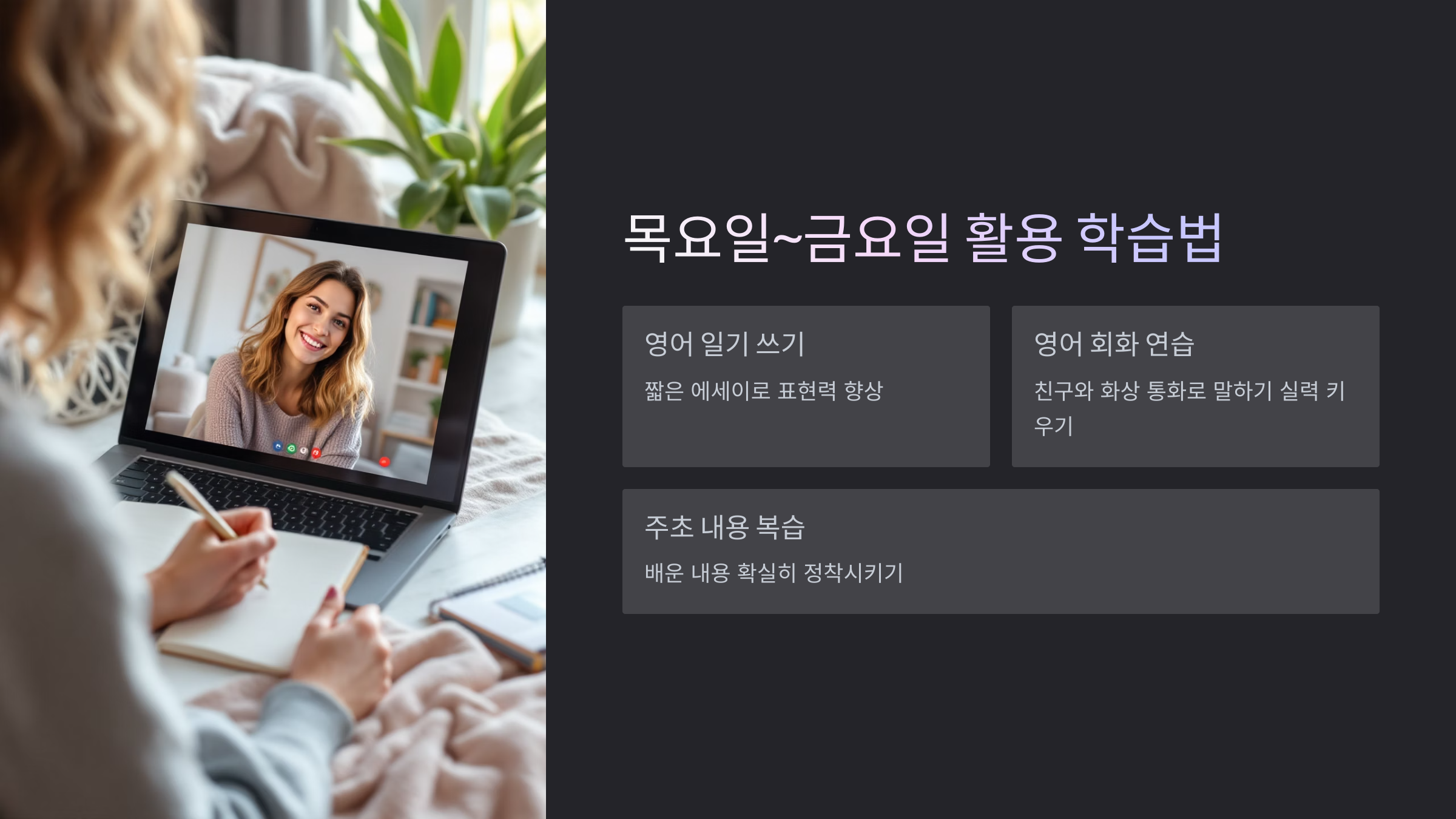 목요일과 금요일은 실생활 영어 활용과 복습에 집중하세요. 영어 일기 쓰기, 영어 회화 연습, 온라인 스터디 참여 등이 좋습니다. 저 같은 경우는 영어로 짧은 에세이를 쓰거나 친구와 화상 통화를 하며 말하기 실력을 키웠어요. 또한 주초에 배운 내용을 다시 복습하면서 머릿속에 확실히 자리 잡도록 했습니다.