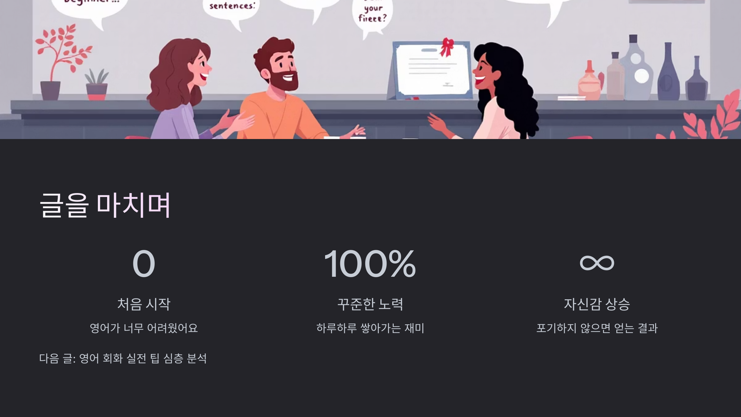 꾸준함이 성공의 열쇠입니다. 목표를 세우고, 달성할 때마다 스스로 칭찬하세요. 저는 공부 일지를 작성해 하루 학습량을 체크하고, 한 달마다 작지만 보상을 주었어요. SNS에서 영어 공부 인증도 하고, 영어 관련 커뮤니티에 참여해 동료들과 소통하면 동기 부여가 훨씬 쉬워집니다.