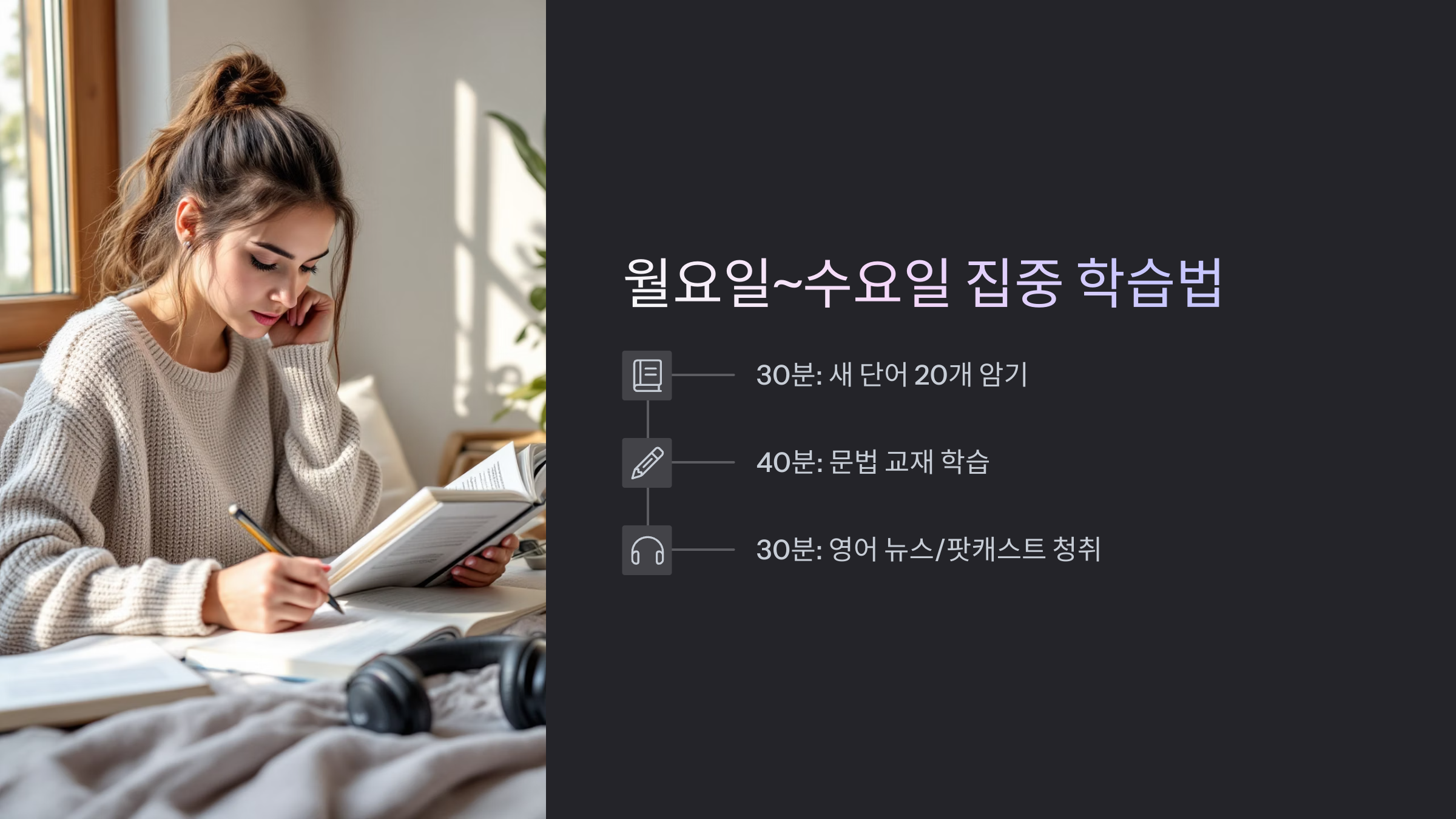 월요일부터 수요일은 영어 실력 향상에 가장 중요한 날이에요. 이때는 새로운 단어와 문법을 익히고, 듣기와 독해를 집중적으로 공부합니다. 하루에 30분씩 새로운 단어 20개 암기, 40분은 문법 교재 학습, 나머지 30분은 영어 뉴스나 팟캐스트 청취로 귀를 트이게 하세요. 저도 이 루틴 덕분에 빠르게 어휘력이 늘었답니다.