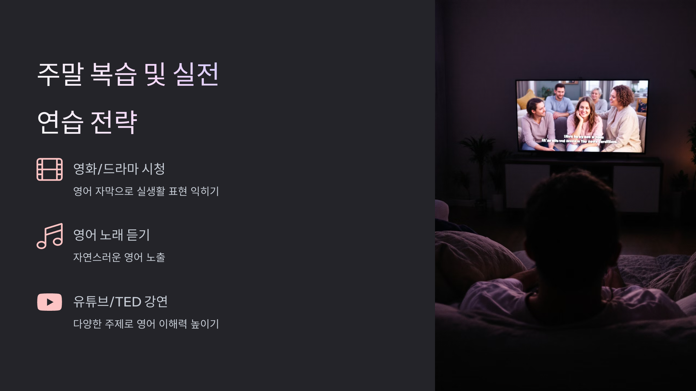 주말은 주중에 배운 내용을 편안하게 복습하는 시간이 필요합니다. 영화, 드라마 시청, 영어 노래 듣기 같은 가벼운 활동으로 영어에 자연스럽게 노출되게 하세요. 저는 영화 자막을 영어로 켜서 보면서 실생활 표현과 억양을 익혔습니다. 또한, 영어 관련 유튜브 강의나 TED 강연을 보는 것도 큰 도움이 됩니다.