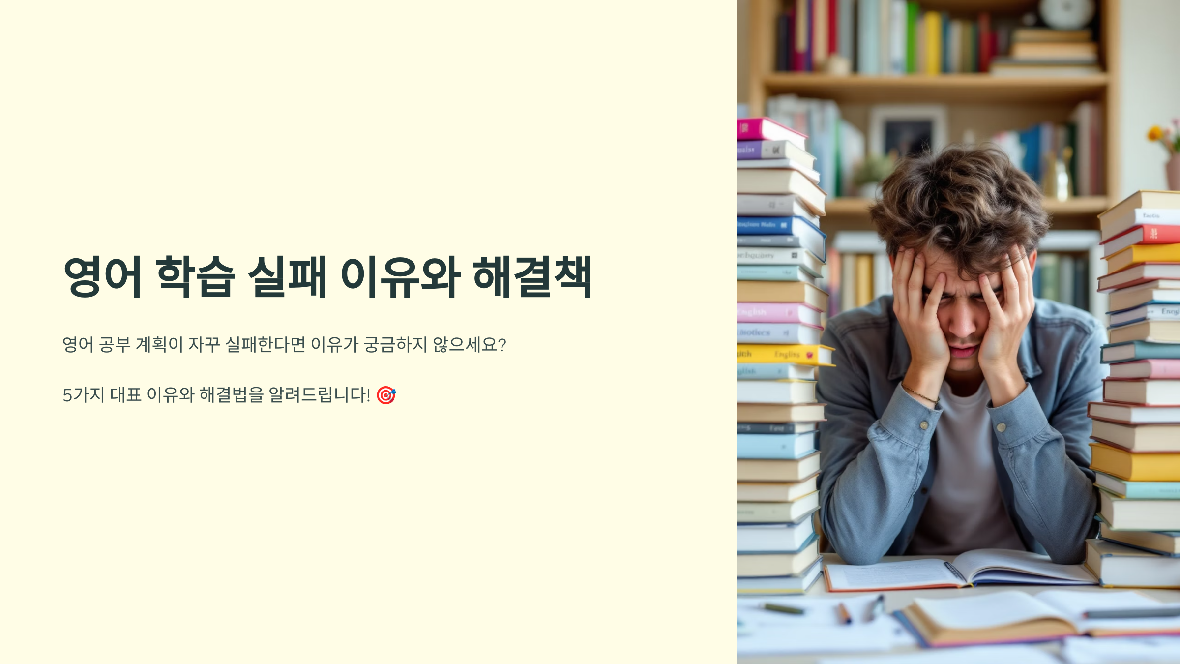 영어 공부, 마음먹고 시작했는데 자꾸 실패한다면 이유가 뭔지 궁금하지 않으세요? 이 글에서는 영어 학습 계획이 실패하는 5가지 대표 이유와 함께 그에 맞는 해결법을 드릴께요! 누구나 겪을 수 있는 문제지만, 제대로만 고치면 분명 성공할 수 있습니다. 🎯