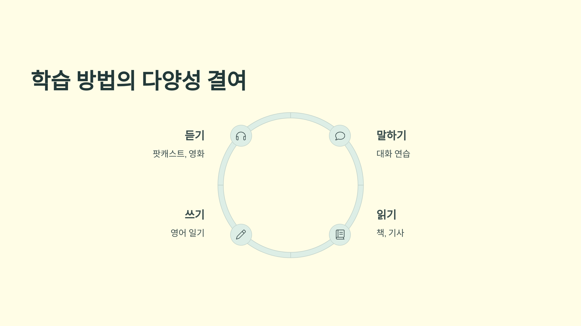 하나의 공부법에만 의존하면 흥미가 떨어지고 집중력도 쉽게 잃습니다. 예를 들어 단어 암기만 하거나, 문법책만 보는 식이죠. 듣기, 말하기, 읽기, 쓰기를 골고루 섞어가며 영화, 팟캐스트, 영어 일기 등 다양한 방법으로 접근하면 학습 효율이 높아집니다. 최신 연구에 따르면 멀티미디어 학습이 기억력과 이해력을 크게 높인다고 하니 꼭 시도해 보세요!