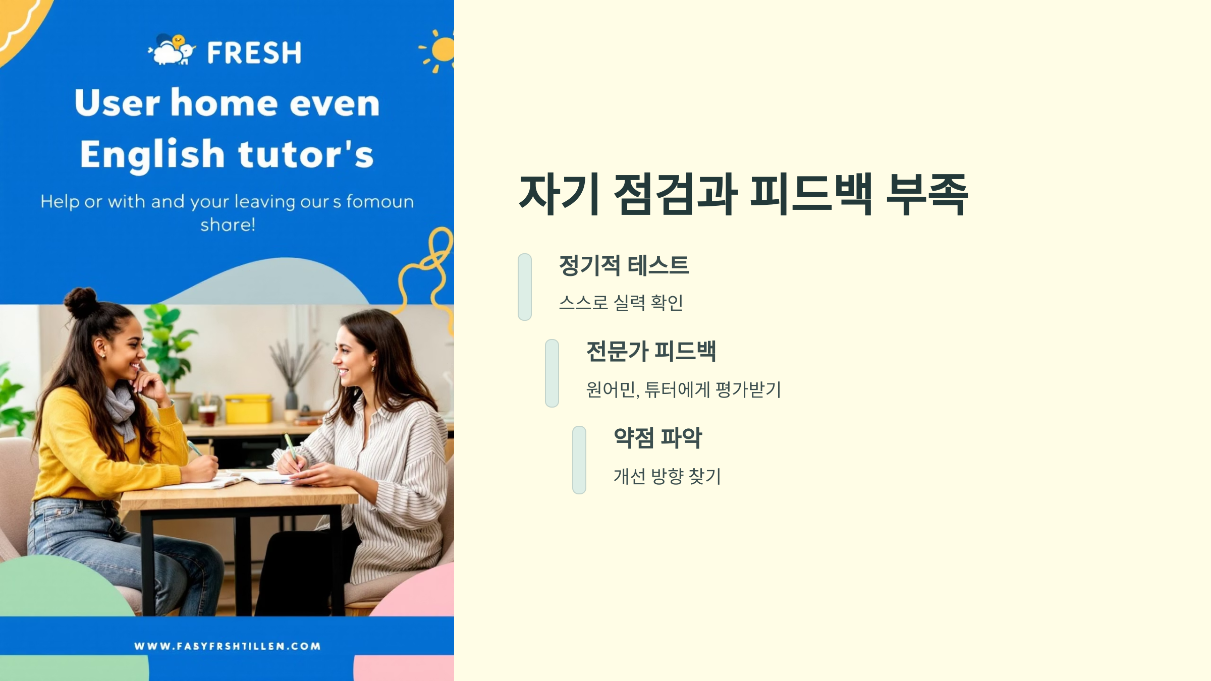 혼자 공부하다 보면 내가 제대로 하고 있는지 점검하기 어렵습니다. 이 때문에 잘못된 습관이 생기거나 실력이 제자리걸음 하는 경우가 많아요. 해결책은 정기적으로 스스로 테스트를 하거나 원어민, 튜터, 스터디 그룹에서 피드백을 받는 겁니다. 이렇게 하면 약점을 정확히 파악하고 효과적인 개선 방향을 찾을 수 있습니다.