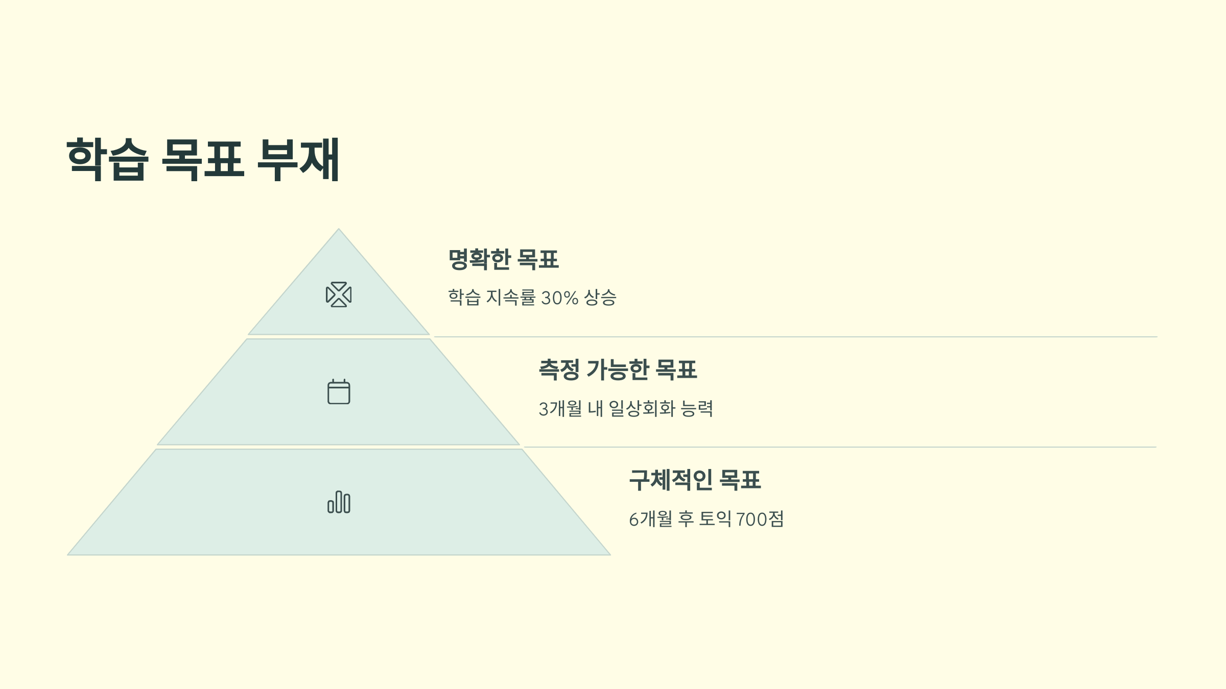 목표 없이 무작정 ‘영어 잘하고 싶다’는 생각만으로는 동기 부여가 떨어질 수밖에 없어요. 예를 들어 ‘3개월 내 일상회화 능력 갖추기’, ‘6개월 후 토익 700점 넘기기’처럼 구체적이고 측정 가능한 목표를 세우는 게 중요합니다. 연구에 따르면 명확한 목표가 학습 지속률을 30% 이상 높인다고 하니, 꼭 시간을 들여 목표를 정해보세요!