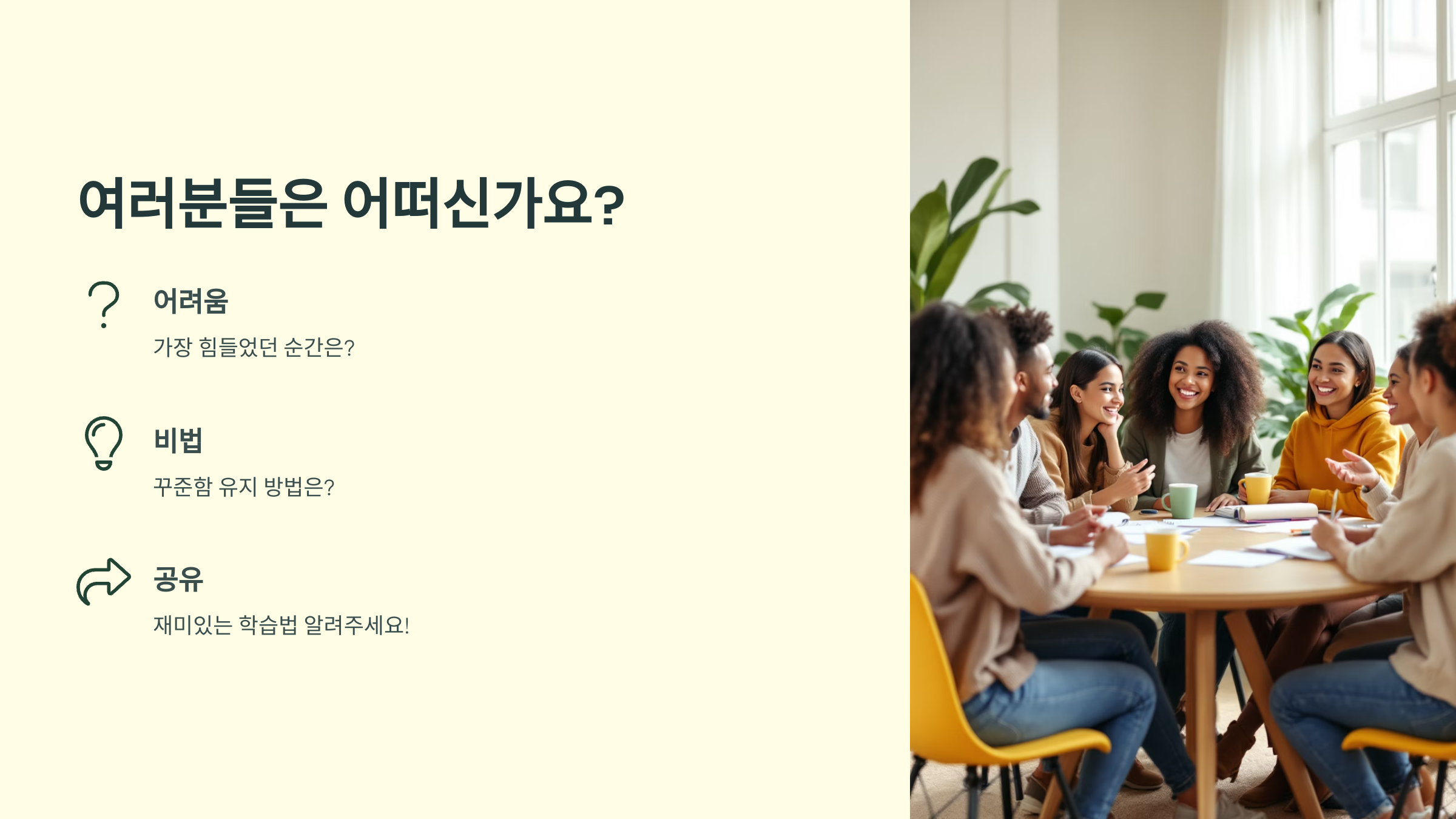 혹시 여러분만의 꾸준함 유지 비법이나 재미있는 학습 방법이 있다면 공유해 주세요!