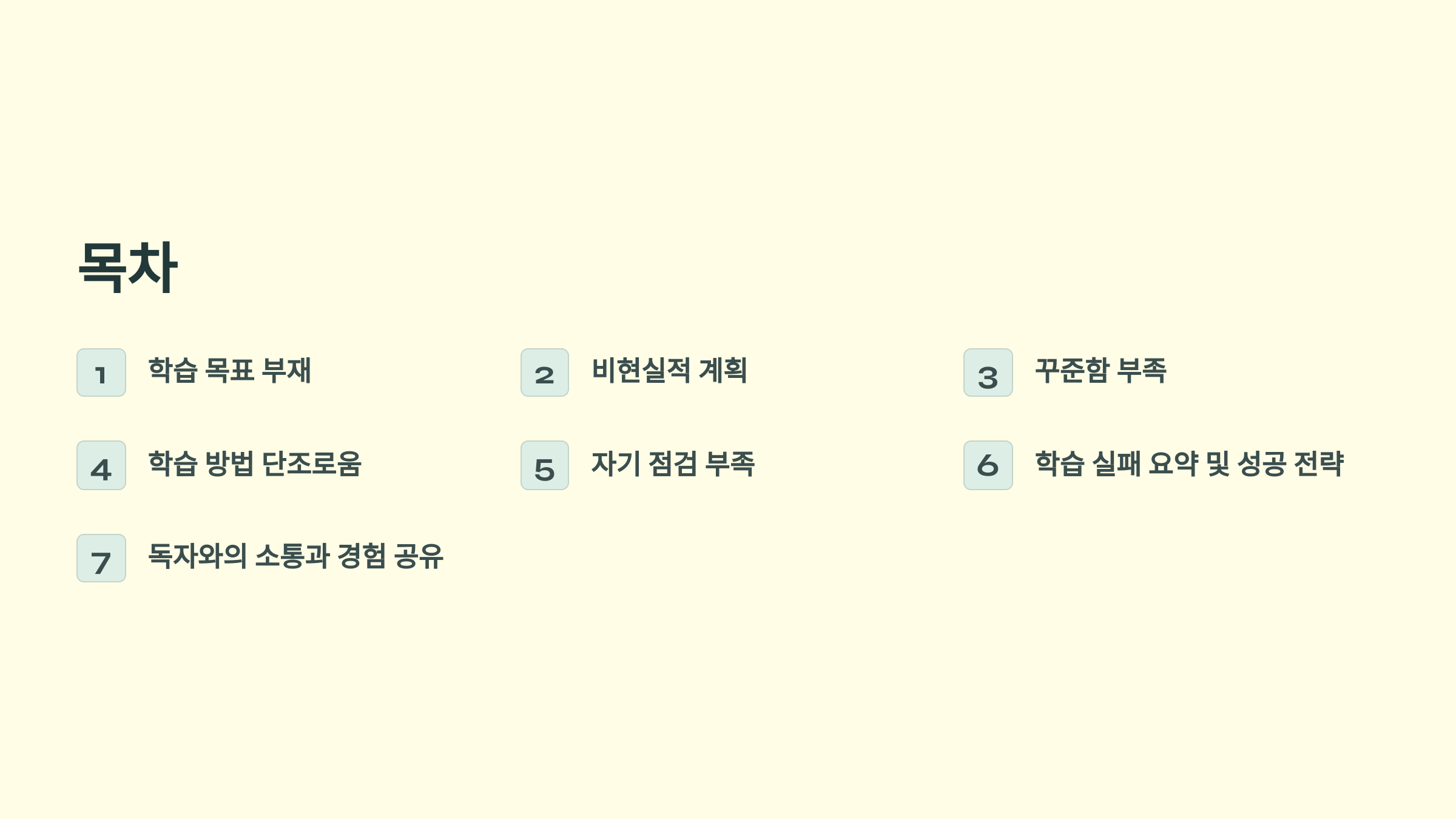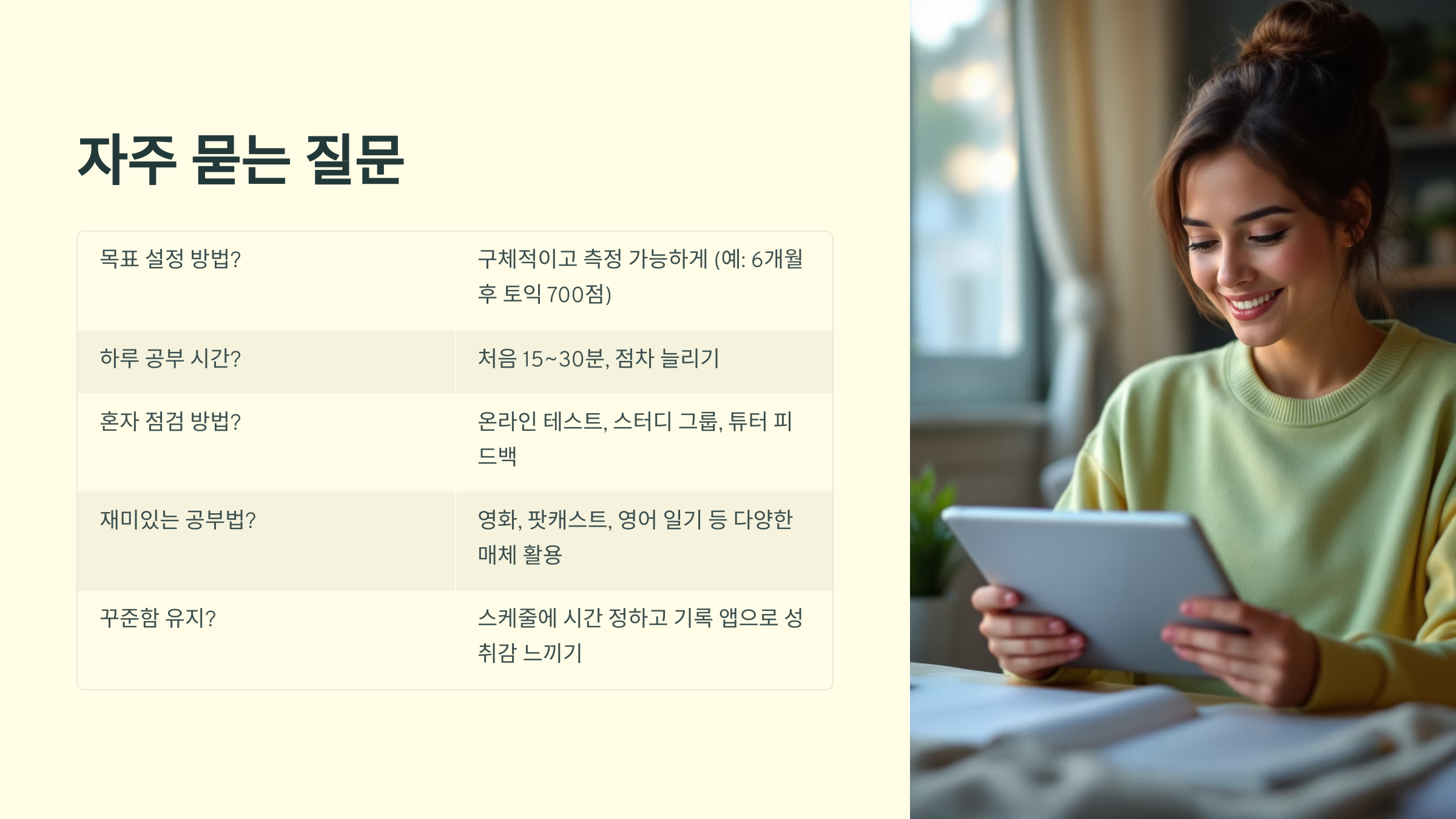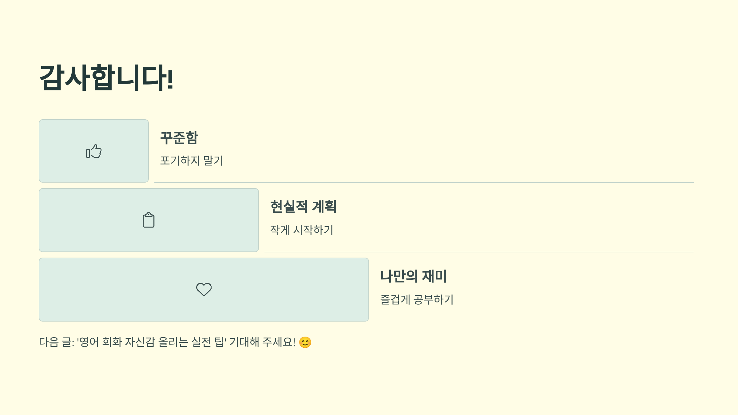 지금까지 이야기한 5가지 실패 이유를 요약하면 ‘목표 없고, 계획이 과하며, 꾸준하지 않고, 방법이 단조롭고, 점검이 부족하다’는 점입니다. 성공하려면 먼저 현실적인 목표를 세우고, 꾸준한 학습 습관을 만들며, 다양한 학습 도구와 방법을 활용해야 해요. 그리고 꼭 피드백을 통해 자기 점검을 하면서 개선해 나가야 합니다. 이렇게 하면 영어 실력이 한 단계씩 확실히 올라가는 걸 체감할 수 있을 거예요! ✅