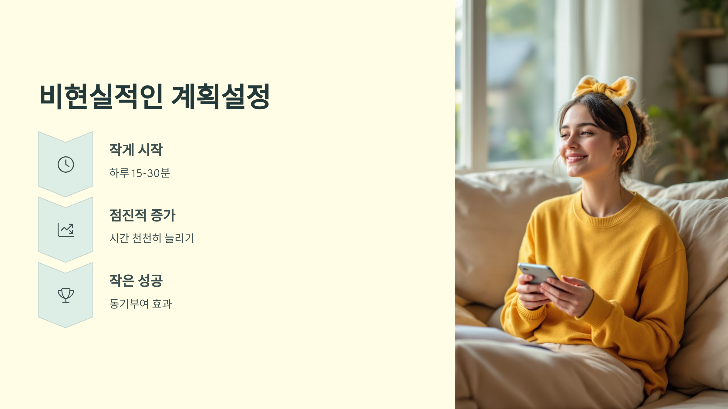 처음부터 너무 많은 분량을 계획하거나 매일 3시간씩 공부하겠다고 무리하는 경우가 많아요. 이럴 경우 금세 지치고 포기하기 쉽습니다. 현실적인 계획을 세우는 게 핵심인데요, 하루 15분에서 30분 정도 꾸준히 하는 습관부터 시작해 점차 늘려가면 훨씬 효과적입니다. ‘작은 성공’ 경험을 쌓아가는 게 동기부여에 가장 좋습니다.