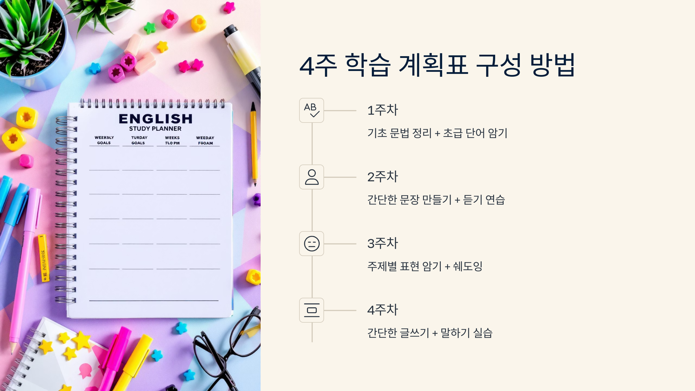 영어는 단기간에 성과를 내기 어려운 과목이에요. 그렇기 때문에 처음 시작할 때부터 체계적인 계획이 필요하죠. 계획을 세우면 내가 어디까지 왔는지, 앞으로 뭘 해야 하는지를 명확하게 파악할 수 있어요. 무작정 단어만 외우거나 영상만 보는 식의 학습은 금방 지치기 쉬워요. 초보자일수록 짧고 실현 가능한 계획을 세우는 것이 핵심이에요! 특히, 4주 단위 계획은 집중력도 유지되고 성취감도 높아서 추천드릴게요 ✅