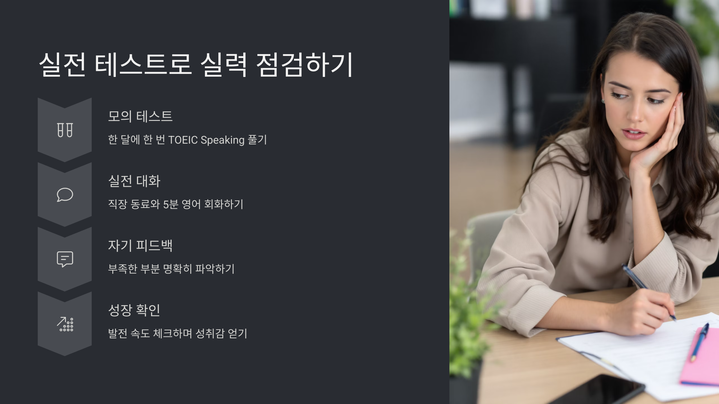 정기적으로 자기 실력을 점검해야 발전 속도를 알 수 있어요. 예를 들어 ‘한 달에 한 번 모의 TOEIC Speaking 풀기’, ‘직장 동료와 5분 영어 회화하기’ 같은 소소한 테스트도 좋아요. 성취감도 생기고, 부족한 부분이 명확히 보이거든요. 스스로 피드백 주는 습관도 영어 실력 향상에 큰 도움 됩니다.