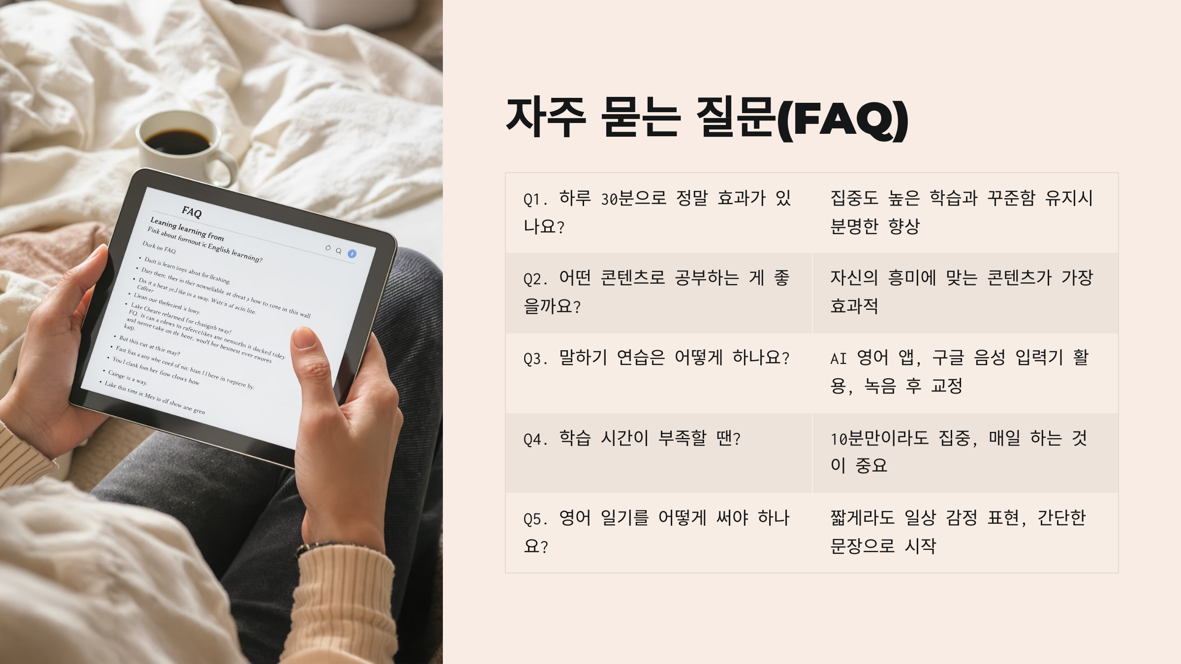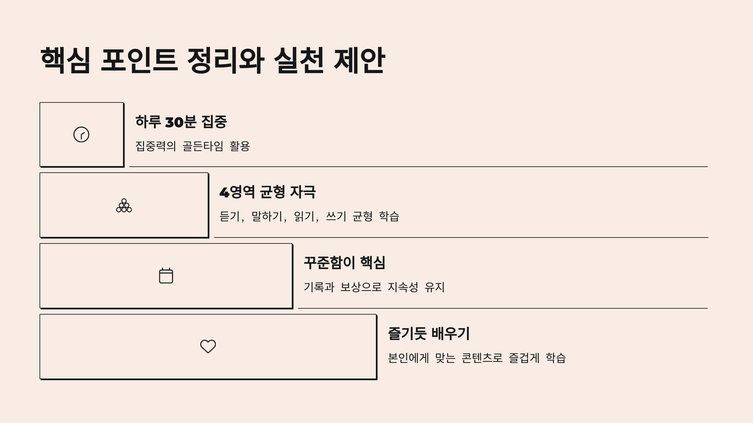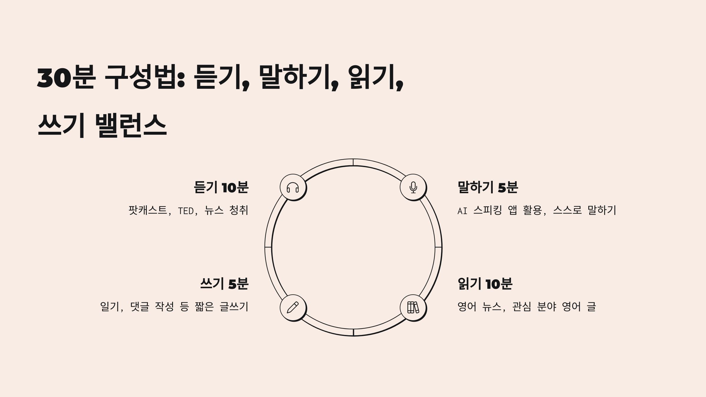 - 30분 구성법: 듣기, 말하기, 읽기, 쓰기 밸런스 맞추기