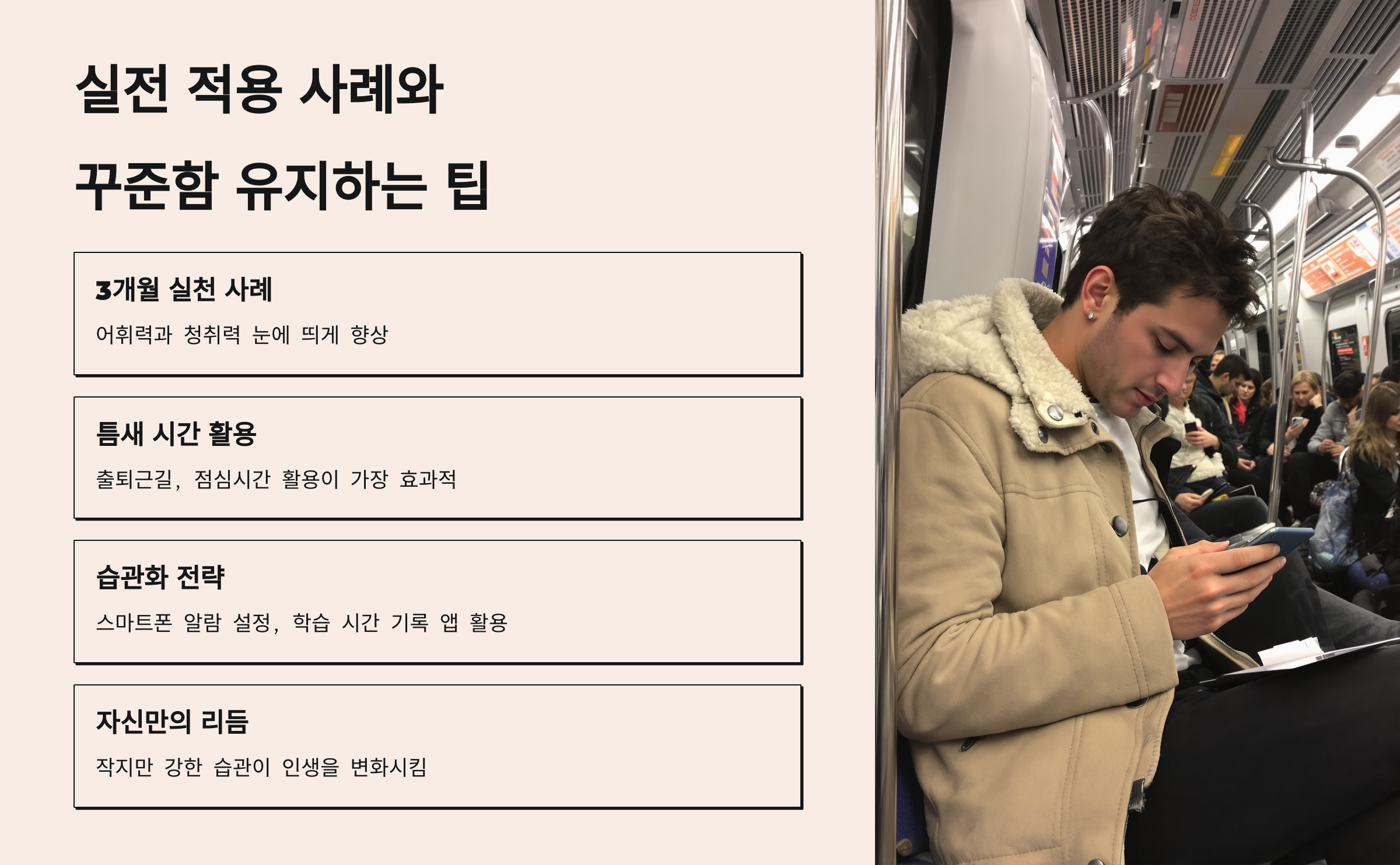 실제로 30분 루틴을 3개월 실천한 분들의 후기를 보면, 어휘력과 청취력이 눈에 띄게 좋아졌다는 반응이 많아요. 특히 출퇴근길이나 점심시간을 활용한 사람들이 가장 꾸준하게 실천하더라고요. 중요한 건 ‘습관화’입니다. 스마트폰 알람 설정, 학습 시간 기록 앱 활용 등으로 자신만의 리듬을 만들어보세요. 작지만 강한 습관이 인생을 바꿉니다 💪