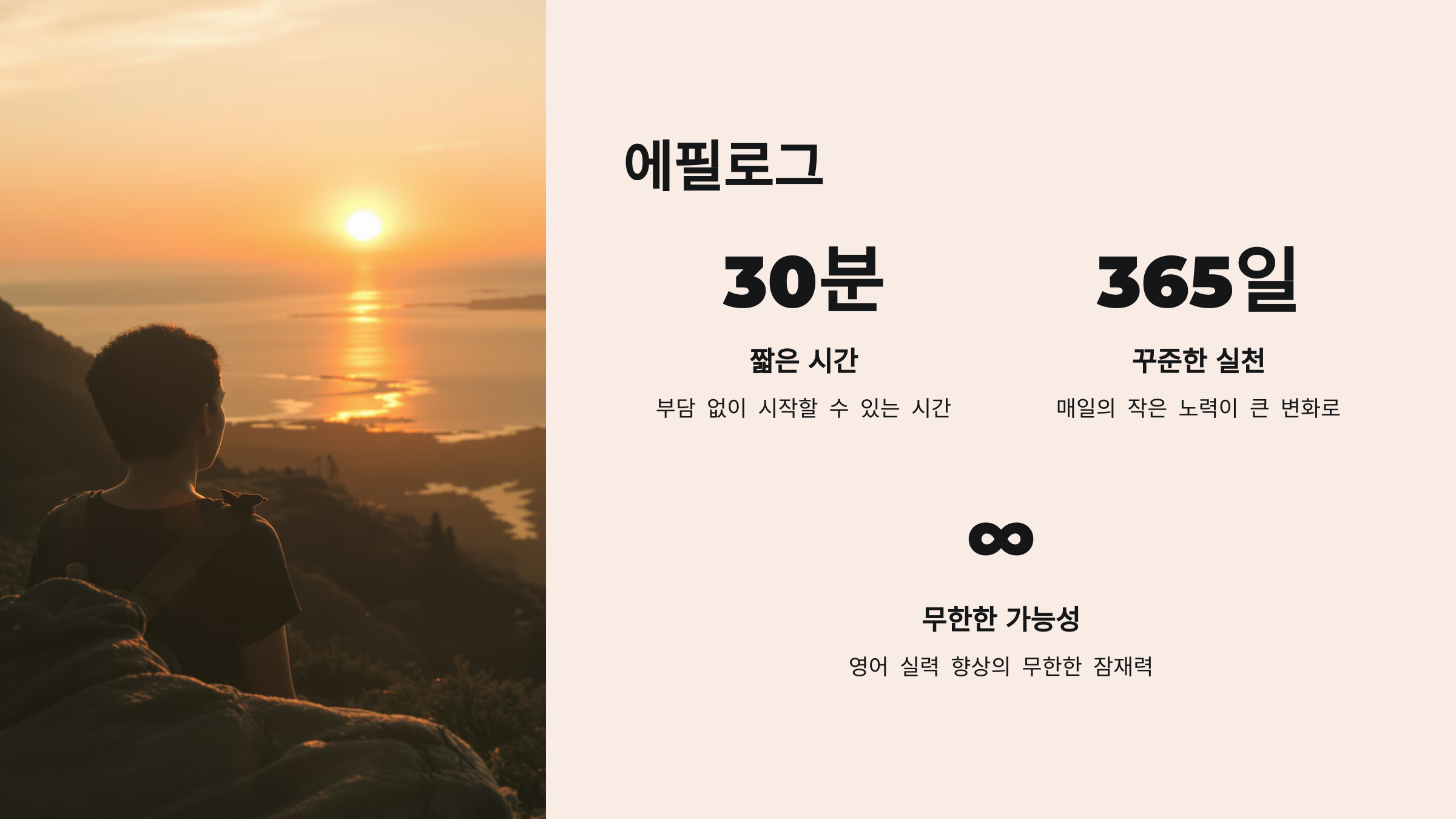 저도 처음엔 영어에 거부감이 있었지만, 하루 30분씩 꾸준히 반복하면서 서서히 자신감을 얻었습니다. 여러분도 부담 없이 시작해보세요! 시간은 짧아도 그 힘은 절대 작지 않다는 걸 느끼실 수 있을 거예요. 다음 글에서는 무료로 활용할 수 있는 영어 학습 앱을 소개해드릴게요! 기대해주세요 😊