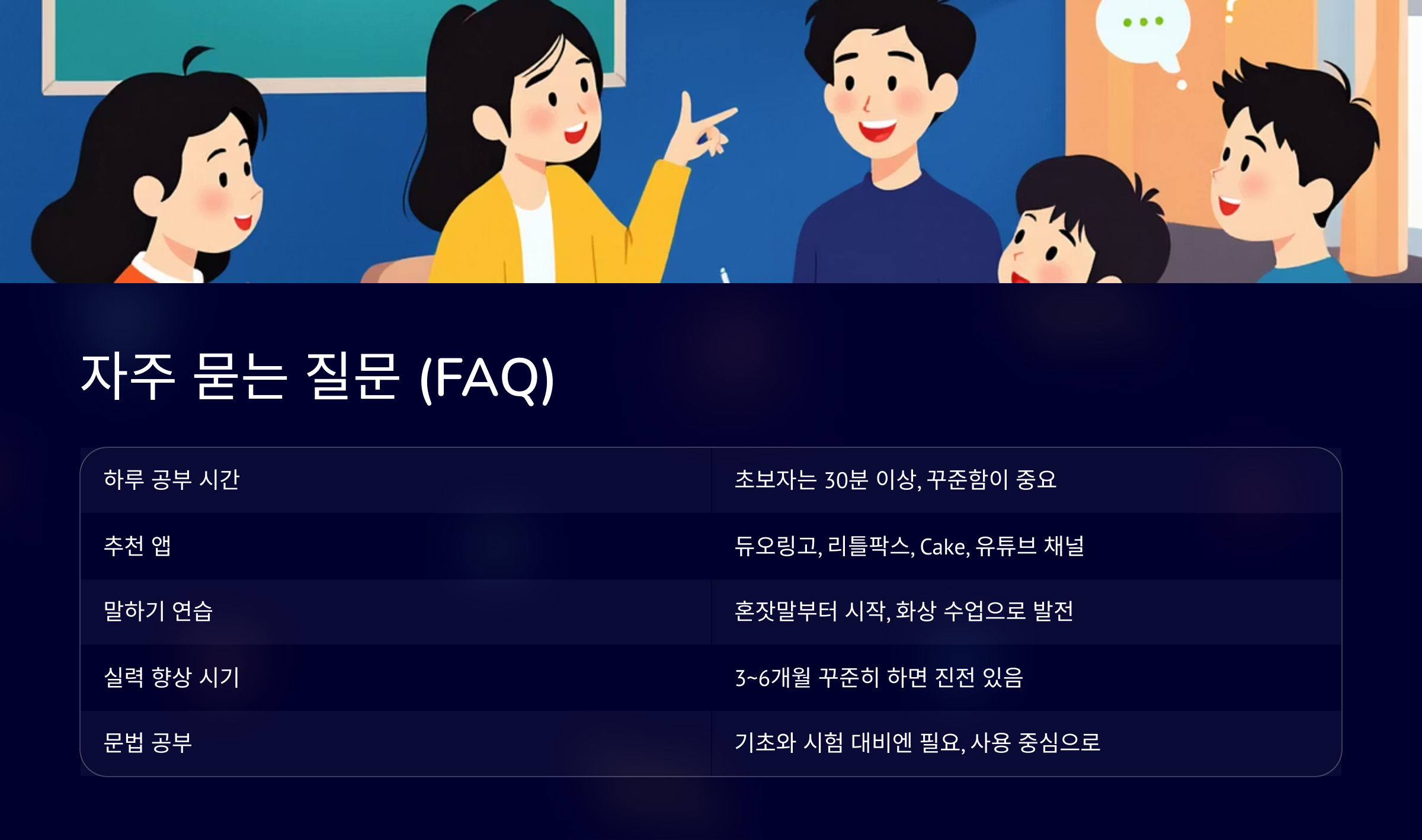 보통 3~6개월 정도 꾸준히 하면 듣기와 말하기에 진전이 있어요. 꾸준함이 핵심입니다.