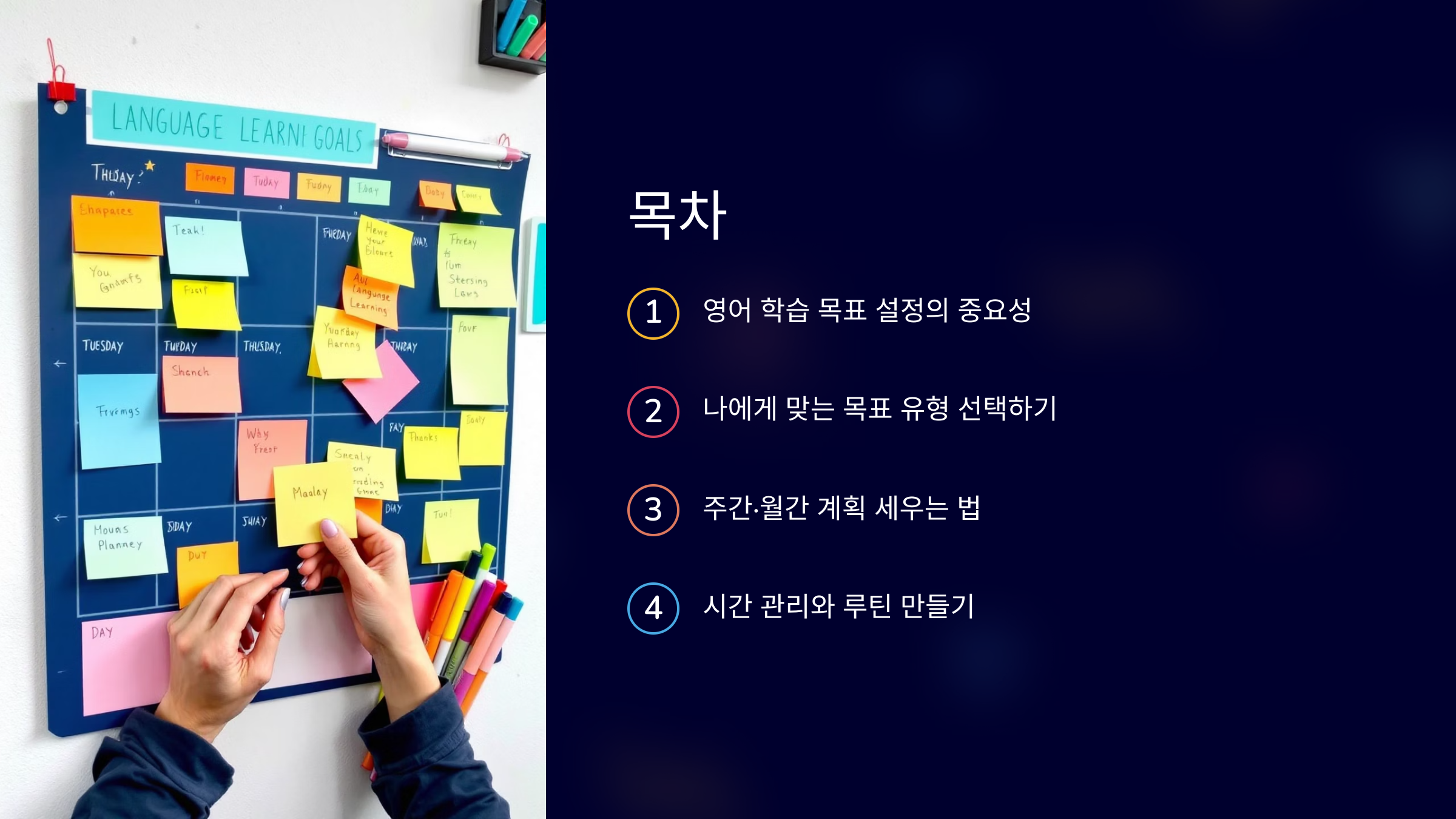 성공적인 학습은 명확한 목표에서 시작됩니다. "올해 영어 공부 열심히 해야지"라는 추상적인 다짐보다, "2025년 12월까지 토익 850점 달성"처럼 구체적인 목표가 필요하죠. 📅